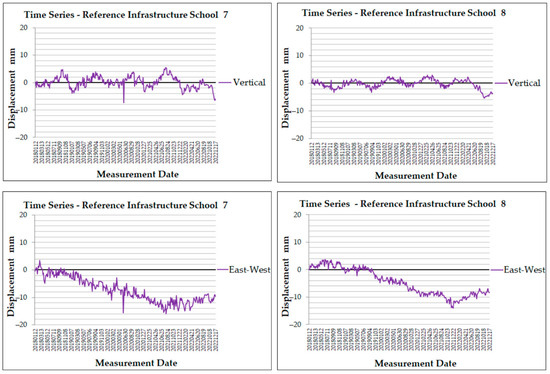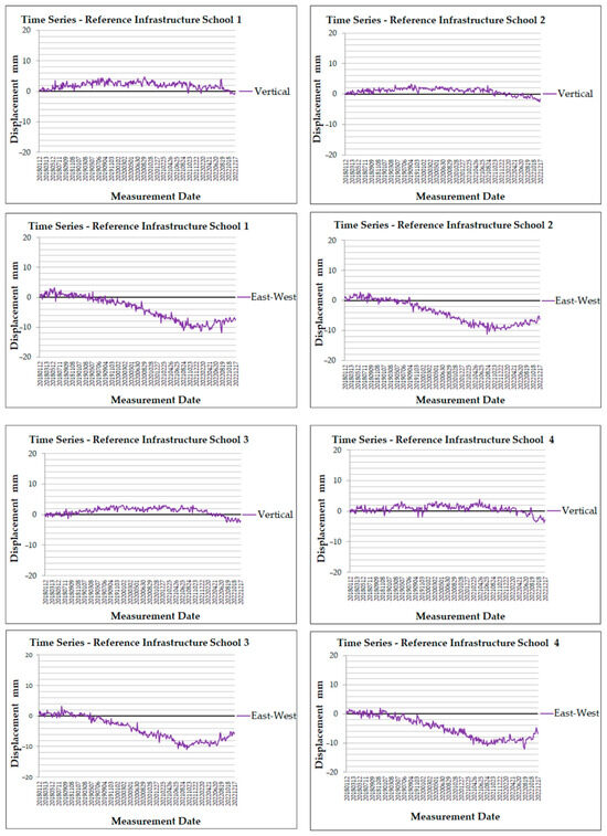 In School 4, the vertical displacement has values near 0 mm, suggesting no significant vertical movement in the MP. Minor fluctuations are observed, with the highest peak reaching 3.9 mm in April 2021 and the lowest value reaching −2.8 mm at the end of the dataset. Regarding the east–west displacement time series, fluctuations are more pronounced, with small peaks and a negative trend from the year 2019. Towards the end of the timeline, values reach −12.1 mm in August 2022. After approaching the minimum value, the data indicates a minor recovery towards zero, suggesting a slowing of the westward movement.