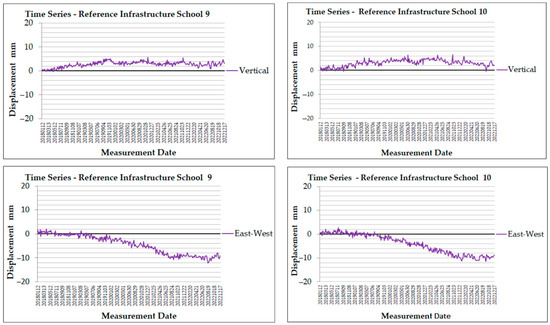 From the beginning, the MP for School 9 shows only positive values and generally presents a stable uplift that does not exceed 5.7 mm (end of 2020). Values range from 5.7 mm to −0.3 mm during the dataset, ending with a value of 3.1 mm. The east–west time series is stable until the middle of 2019, after which a steady downward trend appears, demonstrating westward movement. The minimum value of −12.1 mm occurs in August 2018. After that, a small increase is observed, reaching −9.1 mm at the end of 2022, though the westward movement persists.