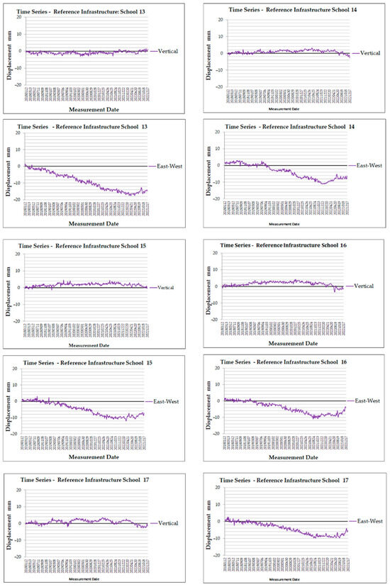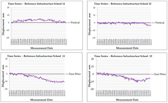 The vertical displacement time series for School 12 (Figure 19) shows many low values during the dataset range around 0, from 1.4 mm to −4.3 mm. Only after June 2022, there is a small downward trend, with the lowest value of −4.3 mm in August 2022. The dataset concludes with a value of −4.1 mm. The east–west displacement time series reveals a clear downward trend, reaching −11.2 mm in October 2021. By the end of the period, the value of −5.3 mm indicates a slowing motion towards the west.