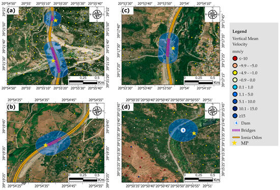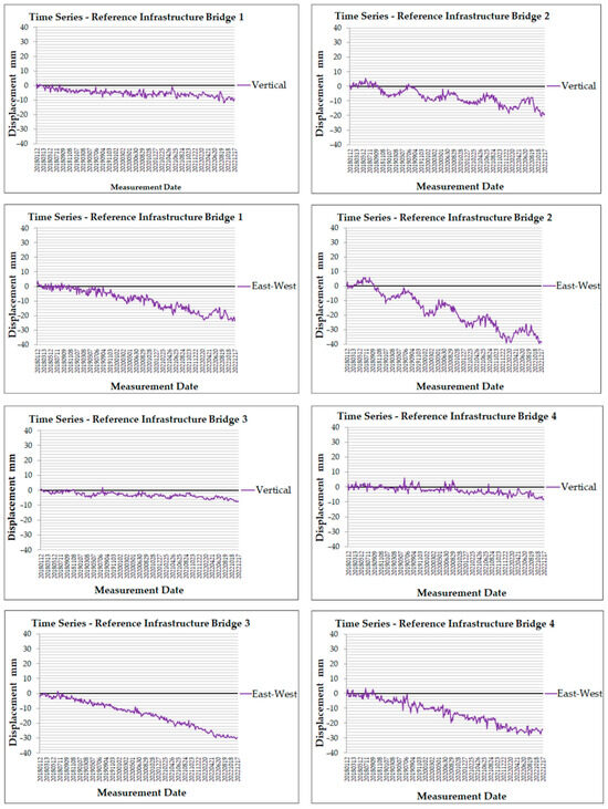 For each critical infrastructure within the study area, the nearest measurement point was identified to generate time series data for both vertical and east–west displacements (Table A1, Table A2, Table A3 and Table A4 in Appendix A). This allowed for a detailed trend analysis of ground motion across the study period (2018–2022), enabling an assessment of the impact of ground deformation on key infrastructures.