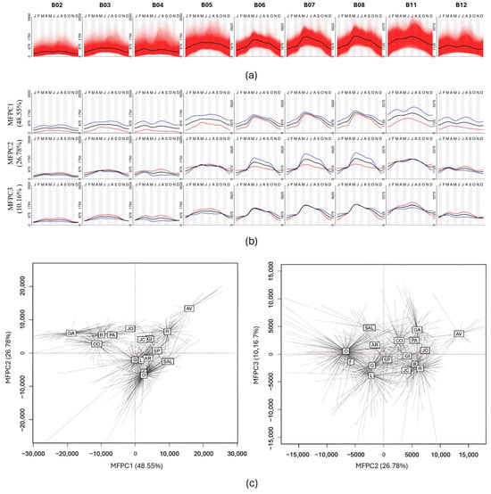 Figure 4a shows the weekly smoothed functions of seasonal variations across the spectral bands for each pixel in the study area. Using these functions, the MFPCA extracted the main components (MFPC components), or the principal orthogonal modes, of temporal variation throughout the year (Figure 4b). The proportion of variance explained by the identified functional components (eigenvalues) is reported in Figure A1. Figure 4b illustrates the temporal patterns of the first three MFPC components, which, together, account for 85.51% of the total variation.