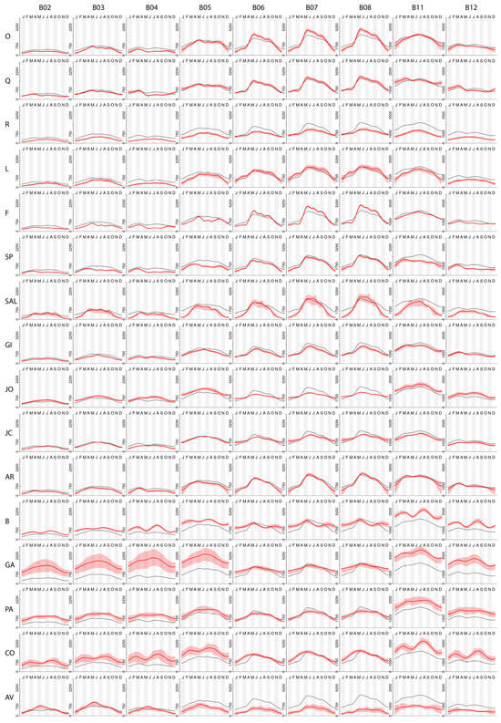 Seasonal temporal profiles of the target classes across various spectral bands correspond to the 1118 reference data points. The bold red line represents the mean vegetation band variation. The red polygon shows the 10th–90th percentile range. The black line represents the mean vegetation band variation for the entire study area. The row acronyms denote the plant associations and habitats listed in Table 1, while the columns refer to the different Sentinel-2 bands.