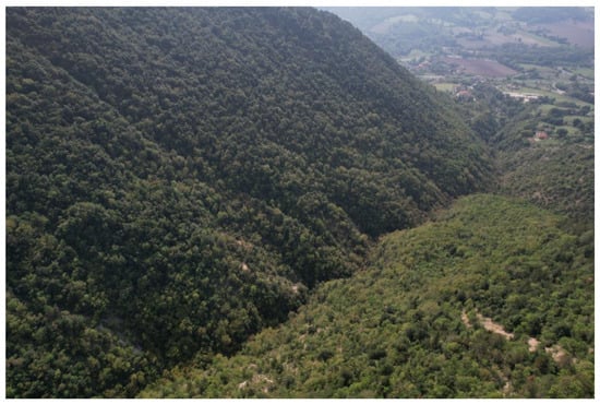 The study area covers 51.95 km2 and is located along the central Apennine ridge in the Marche Region, Italy (Figure 2). It encompasses territories within the Gola del Furlo State Nature Reserve and the Natura 2000 sites, specifically the Special Protection Area (SPA) “Furlo” (IT5310029) and the Special Area of Conservation (SAC) “Gola del Furlo” (IT5310016). The area features significant topographical variation with predominantly calcareous bedrock. It includes Monte Pietralata (888 m) to the north and Monte Paganuccio (974 m) to the south, divided by a narrow gorge carved by the Candigliano River. The mean annual precipitation in the area ranges from 950 to 1180 mm, and the mean annual temperature varies between 10.5 °C and 13.5 °C. According to the bioclimatic classification by Rivas-Martinez et al. [43], the area belongs to the temperate macro bioclimate with a weak sub-Mediterranean level, which indicates low summer aridity in areas below 600 m in altitude [44]. The vegetative landscape is predominantly characterized by forests and summit meadows.