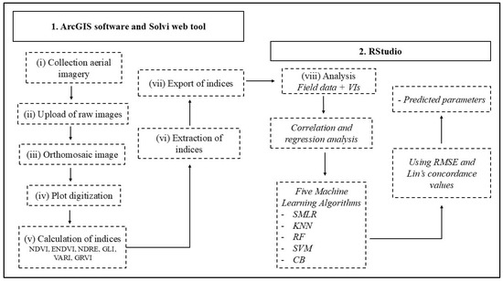 Imagery acquired from the multispectral camera was processed into a composite orthomosaic image using a web processing tool, Solvi (https://solvi.ag/features, accessed on 15 April 2022 which was previously owned by Precision Hawk) [18]. Individual plots were digitized, and their vegetation indices were extracted. The extracted file was exported as a comma-separated-value (CSV) file into Excel for further arrangement and processing. ArcGIS version 10.5 was further used to digitize and process some of the images as shown in the workflow (Figure 2).