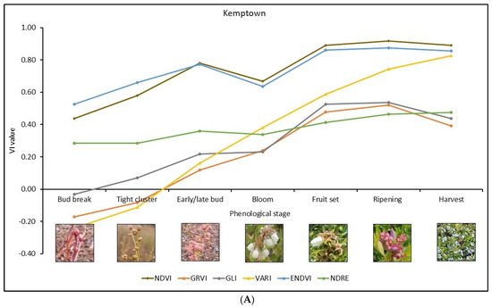 The trend of VI measurements using the UAV multispectral sensor was similar at the two locations. The UAV measurements clearly illustrated that the NIR VIs were separated from the VIS vegetative indices, except for NDRE (Figure 6). At both locations, NDVI and ENDVI obtained the highest VI values with a >100% and a 60.6% increase at harvest, respectively, compared with the other indices across the phenological stages. NDRE at the Kemptown and Lemmon Hill locations observed a 67.9% and a 51.7% increase in VI value at harvest, respectively. The VIS vegetative index from both locations progressed from the negative quadrant into the positive quadrant, with increases of over 100% in VI values for all three indices (GLI, GRVI, and VARI), with VARI being the highest. From both fields, VARI performed best among the three (3) VIS vegetative indices, followed by GLI and then GRVI at all phenological stages (Figure 6). Interestingly, VARI observed continuous growth until an almost equal value was observed with NDVI and ENDVI at the Kemptown field site, giving it the highest increase in VI value at harvest compared with the initial bud break value. Though a similar effect of VARI was not seen at Lemmon Hill, it observed the highest increase compared with the other VIS indices. All VIs observed a varying degree of decline at the bloom stage.