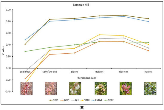 After the bud break stage, it was observed that the increasing trend of VIs was disrupted at the flowering stage, where several VIs exhibited a moderate to severe decline. This phenomenon was confirmed by the work of Hassan et al. [7], who reported a 10% decline in VIs at the flowering stage. This decline was reflected in the Lemmon Hill field, with an even greater decline observed in the Kemptown field.