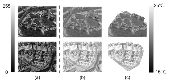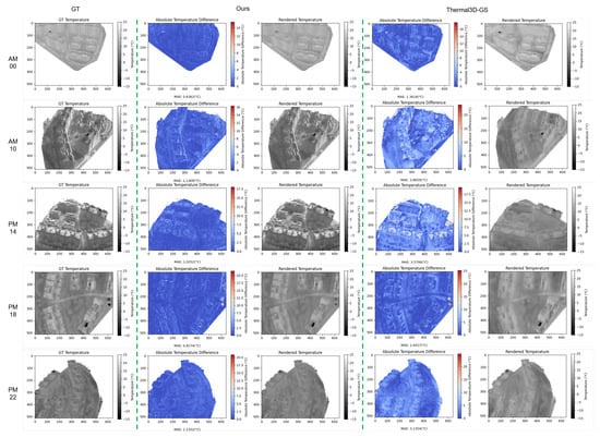 Table 6 presents the MAE results for different experimental groups. In the first group, using Cross-Time uniform sampling, ThermalGS achieved an average error level of 1 °C. The visualization results of the temperature prediction are shown in