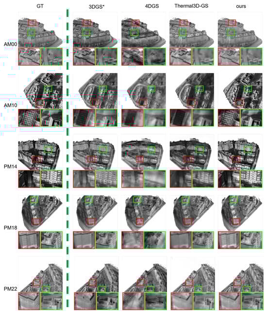 Figure 8. The comparisons for the five time periods are arranged vertically, while different methods are compared horizontally. For 3DGS*, although it maintains geometric accuracy of the scene, the model tends to learn the average thermal radiation across the five time points, failing to capture the temporal variation trend. This is particularly evident in the visual results for AM10, PM14, and PM18. On the other hand, while 4DGS [