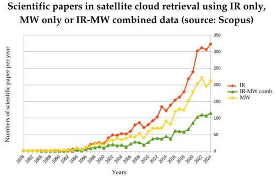 Number of scientific papers per year focusing on cloud parameter retrievals using only IR (red), only MW (yellow), or combined IR–MW (green) satellite passive observations (source: Scopus, https://www.scopus.com/search/form.uri?display=advanced (accessed on 27 November 2024)).