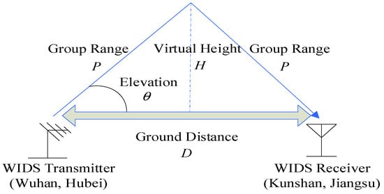 And, according to the geometry presented in Figure 3, the ground distance can also be calculated from the group range , the reflection virtual height , and the elevation angle . It can be expressed as follows: