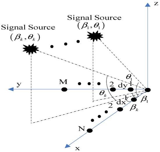 Supposing that there are narrow-band sources, , with the same wavelength impinging on the array from directions , where and denote the azimuth and the elevation angle of arrival of the signal, respectively. Then, the array steering vector can be expressed as follows: