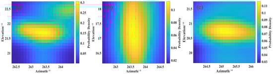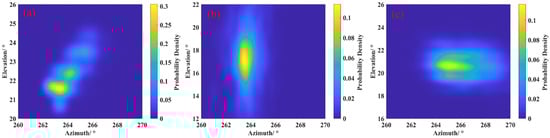 Significantly, the probability density distribution of the measurement results has a unimodal form; thus, the filtering of colored noise interference results can be achieved by selecting the angle estimation results of the probability density main peak region. For the determination of the main peak area, this paper adopts a strategy of selecting a 2° neighborhood range centered on the maximum probability density. Hence, according to Figure 6, the main peak region results for frequency can be obtained as shown in Figure 7, and the corresponding highest probability density points are (263.4°, 21.7°), (263.6°, 17.2°), and (265.1°, 20.7°).