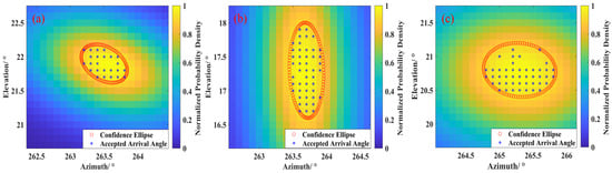 Consequently, when the selected confidence level is 0.9, the accepted measured arrival angle values between the straight ellipse and its interior can be obtained as shown in Figure 9. The corresponding number of accepted azimuth–elevation pairs are 138, 123, and 238, with ratios of 4.31%, 5.43%, and 8.30%. Although angle optimization has eliminated most of the results, it can still ensure an average of more than 10 outputs per minute without affecting the timeliness of long-range short-wave positioning.