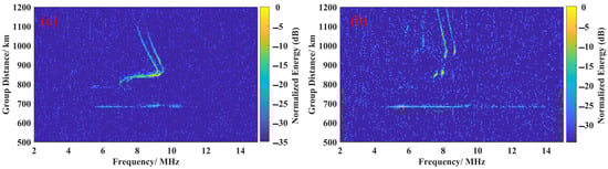 Oblique ionograms of arrival angle estimation period: (a) ionogram of LT 8:36, 15 August 2022; and (b) ionogram of LT 9:16, 15 August 2022.