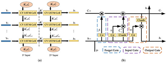 (a) A two-layer CV LSTM. (b) Architecture of a CV LSTM cell.