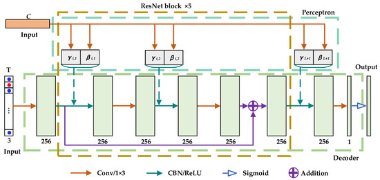 The architectures of both the RV perceptron and the RV decoder are shown in Figure 5. For the RV perceptron, the main operation is a one-dimensional (1-D) convolution. Its input is the encoded feature vector , and its outputs are the parameters and , which are used for CBN in the RV decoder. The RV decoder mainly consists of five residual blocks, and the operations in each block comprise 1-D convolution, CBN, ReLU, and addition. Beyond these residual blocks, one CBN, 1-D convolution, and sigmoid operation exist at the end. The inputs of the RV decoder are the 3-D coordinate positions of the sampling points in the unit target space, and the output is a set of occupancy probabilities for all the sampling points.