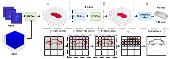 In the first step, a unit volume space, different from the unit target space in the training stage, is discretized into multiple voxels at an initial resolution, and the vertices of each voxel are also called grid points. Then, the SFONet is used to evaluate the occupancy status of each grid point . If ( is a threshold), mark the grid point as occupied; otherwise, mark it as unoccupied. When a voxel has more than two adjacent grid points with different occupied states, this voxel is marked as active, which means that this voxel may be the boundary location of the target. All the activated voxels form the initial 3-D reconstruction target.