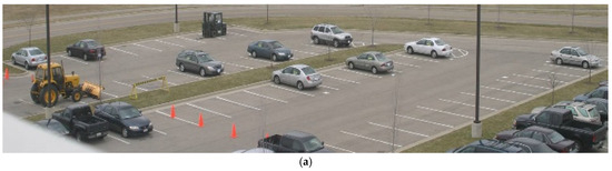 The Gotcha echo data [61] were collected by the airborne fully polarimetric radar system. The observed area was a parking lot, where many civilian cars and industrial vehicles were parked, as shown in Figure 7a. The imaging geometry is shown in Figure 7b, where the radar flew eight passes around the target area in a circular trajectory. During the data collection on each pass, the azimuthal interval is about 1 degree. We use the HH polarimetric SAR data collected from the first circular pass for imaging. The imaging result is shown in Figure 7c.