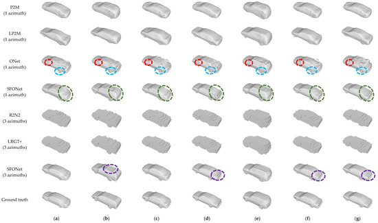 We compare two input modes of the SFONet. Each training or test sample has only one azimuthal image in one input mode. In the other input mode, each training or test sample consists of three equally spaced images in the azimuth, with an interval of 120°. The three indicators obtained for each car are shown in Table 2. Except for the Ford Taurus Wagon, the IoU of each car is higher than 0.9, the CD is lower than 0.071, and the NC is higher than 0.088, regardless of the input modes. The reason is that the details on the surface of the Ford Taurus Wagon model are more complex than those of other car models. When the number of azimuthal images in one sample changes from 1 to 3, the relative growth rates for mIoU and mNC are 2.53% and 0.65%, respectively, and the relative reduction rate for mCD is 21.44%. Using three azimuthal images as the input yields better metrics than one azimuthal image because significantly more structural information is implied in three azimuthal images than in one.