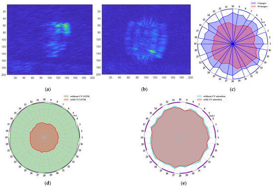 Then, we illustrate the role of CV LSTM by using the above conclusion. The above 36 azimuthal images of the Camry are still used. Suppose that each input of the SFONet is a test sample consisting of three azimuthal images. For each image (i = 1, 2, 3), the corresponding feature vector can be obtained after the CV encoding. When the CV LSTM is added into the SFONet, the fusion feature after CV LSTM and CV attention is denoted as . We calculate the cosine similarity value between each feature vector (i = 1, 2, 3) and for each test sample. All the cosine similarity values of 12 test samples are shown in Figure 11d (in red). When the CV LSTM is not added to the SFONet, the fusion feature vector after the CV attention is denoted as . We also calculate the cosine similarity value between each feature vector (i = 1, 2, 3) and for each test sample. All the cosine similarity values of 12 test samples are shown in Figure 11d (in green). From Figure 11d, we can deduce that the CV LSTM can obtain rich structural information about the target, since the cosine similarity values in red are much smaller than those in green.