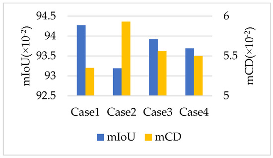 For the convenience of discussion, we define four cases. Case 1: Training samples are from the first three passes, and each sample contains three azimuthal images with an equal azimuthal interval of 120°. Case 2: Training samples are from the first three passes, and each sample contains four azimuthal images with an equal azimuthal interval of 10°. Case 3: Training samples are from the first pass, and each sample contains three azimuthal images with an equal azimuthal interval of 120°. Case 4: Training samples are from the first three passes; the number of sub-apertures per pass is 12; each sample contains three azimuthal images with an equal azimuthal interval of 120°. Three metrics of the four cases are shown in Table 7, Table 8, Table 9 and Table 10, respectively, where the mIoUs and mCDs of four cases are visualized in Figure 12. Comparing the metrics of Case 1 with those of Case 2, the performance of the former is superior to that of the latter. This means that even if there are fewer input images in a sample, the reconstruction performance may still be better due to the larger azimuthal interval. Comparing the metrics of Case 2 with those of Case 3, the mIoU and mCD of the former are inferior to those of the latter. This means that sufficient azimuthal information from a training sample helps reduce the number of passes, thereby reducing the total number of training samples. Comparing the metrics of Case 2 with those of Case 4, the performance of the former is inferior to that of the latter. It also indicates that a reasonable composition of one training sample can help reduce the number of training samples.