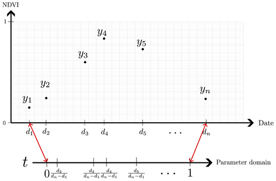 An example of Y time series, plotted using NDVI-Data axis, with the d to parametric domain t mapping.