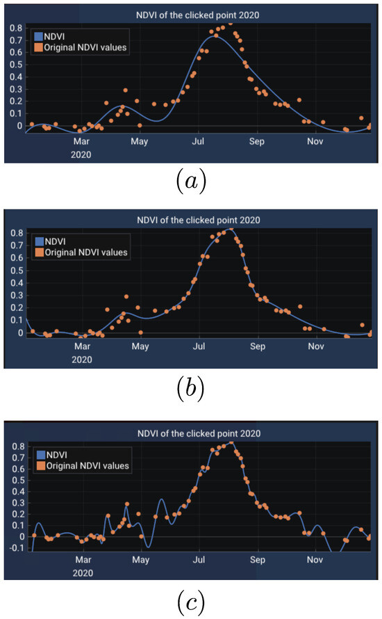 Determining the number of control points m for the B-Spline curve in relation to the number of available NDVI data points n depends on several factors, including the desired smoothness, flexibility of the results, and the expected NDVI pattern shapes influenced by the phenology of crop and vegetation growth [68]. If m is excessively large (in the extreme case where , the curve essentially becomes an interpolation of the data points), it may capture noise within the data and exhibit highly oscillatory or wiggly behavior. This pattern can be seen in Figure 5, where the curve with 30 control points demonstrates oscillatory patterns. On the other hand, if too few control points are used, the model may fail to approximate the data accurately due to an insufficient number of parameters for optimization, as shown in panel (a) of Figure 5. Hence, it is logical to define the number of control points as being proportional to the number of data points:
