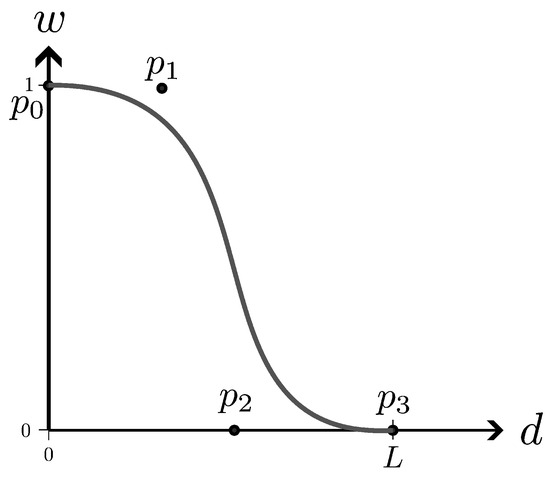 A simple combination method that does not consider these properties may result in lower approximation accuracy; one may achieve the best or worst of both methods. The main hypothesis of this work is that the impact of the spatial approximation must be controlled by the distance of the missing pixel from the perimeter of the missing area. This requires a weight function to control this impact. By incorporating this mechanism into a unified spatial–temporal model, we hypothesize that the resulting weighted approach will enhance overall reconstruction accuracy. To implement the weighting mechanism, we propose a weighted combination based on the distance from the perimeter, utilizing the distance transform (DT). The distance transform generates a distance map, where the value of each pixel represents its distance from the nearest perimeter of an object within the image [18]. Our weight function is defined by applying a decay function to the result of a distance transform to control the transition between spatial and temporal approximations. To have full control over the weight function, we introduce a parametric decay function using Bézier curves. We empirically evaluate and derive the decay function parameters through a dataset that includes the missing patterns in our data.