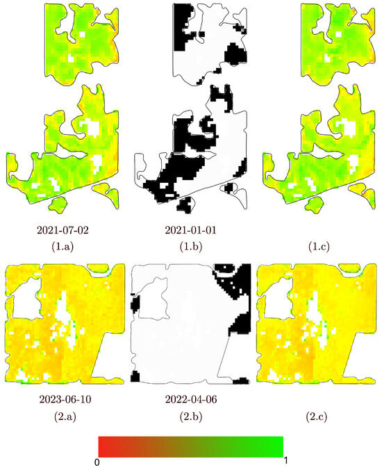 To evaluate our final model’s performance, we compare the results against known ground truth using obstruction-free NDVI images. We then systematically introduce obstruction masks to synthesize regions and compare the model’s output for these synthesized regions to the ground-truth images. The accuracy of the approximation is quantified using Root Mean Square Error (RMSE). For a fair comparison, we use a dataset of real-world cloud and shadow patterns from 16 farm fields in western Canada, sourced from the Sentinel-2 platform between 2018 and 2023. These patterns are used as obstruction masks and to derive the decay function parameters. The results show a significant improvement compared to using only purely spatial, purely temporal approximations and the simple weighted combined spatiotemporal model, as measured by RMSE. As a case study, we identify the peak green day for fields using Sentinel-2 imagery during the growth season. The NDVI on this day serves as a performance indicator for the fields. This peak green data is used for various applications, such as creating zone delineation maps for field management [19,20].