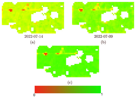 A useful vegetation performance metric derived from NDVI imagery is the peak green image, which captures the maximum NDVI values observed over a specified time period and serves as an indicator of optimal vegetation conditions in agricultural fields [19,20]. The concept of the peak green day refers to the specific date whose NDVI image most closely reflects ideal vegetation conditions—defined by the pixelwise maximum NDVI across the field (referred to as the ideal image). Since individual pixels reach their peak NDVI on different dates, the ideal image may not correspond to any single acquisition date. However, the peak green day image is selected from the available daily images as the one that best approximates these optimal conditions across the entire field.