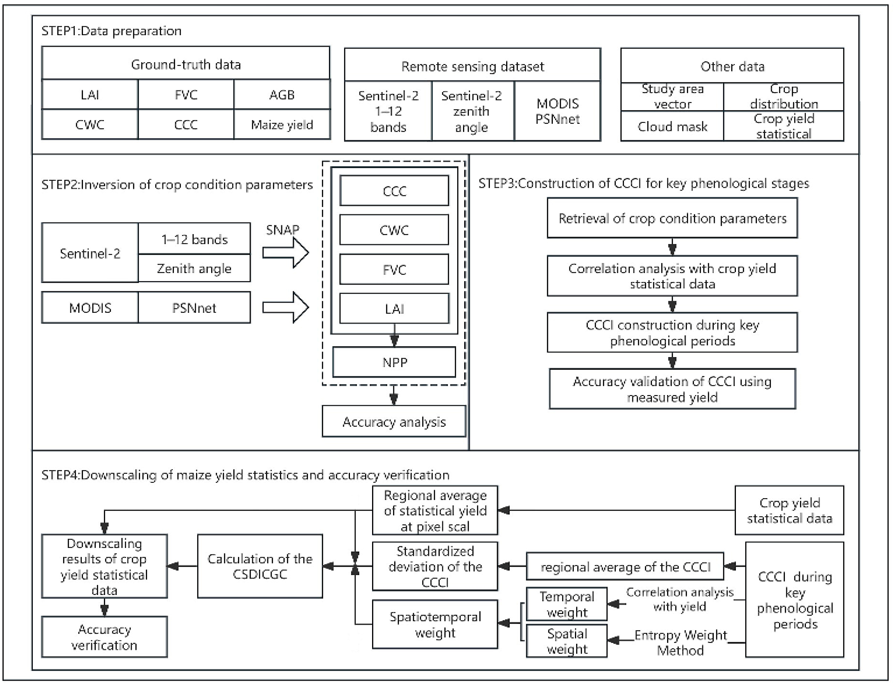 - A downscaling method using the standardized deviation of the CCCI was proposed to effectively transform crop yield statistics from administrative units to the pixel level.