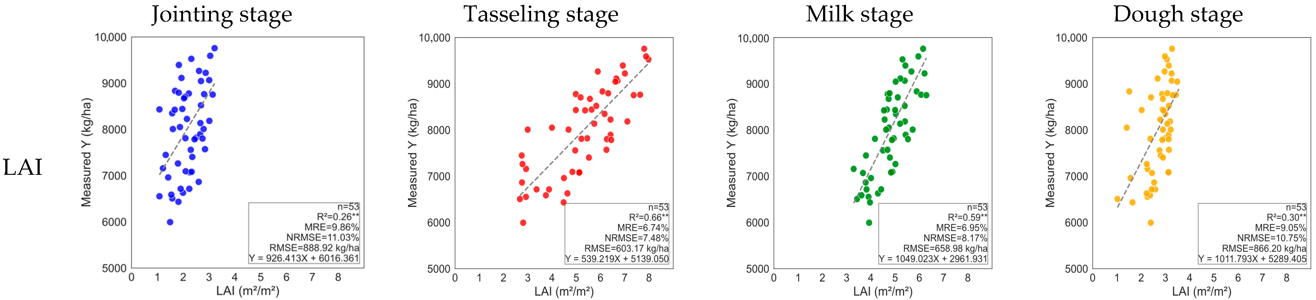 4.2.1. Correlation Analysis Between Crop Condition Parameters in Key Phenological Periods and Crop Yield