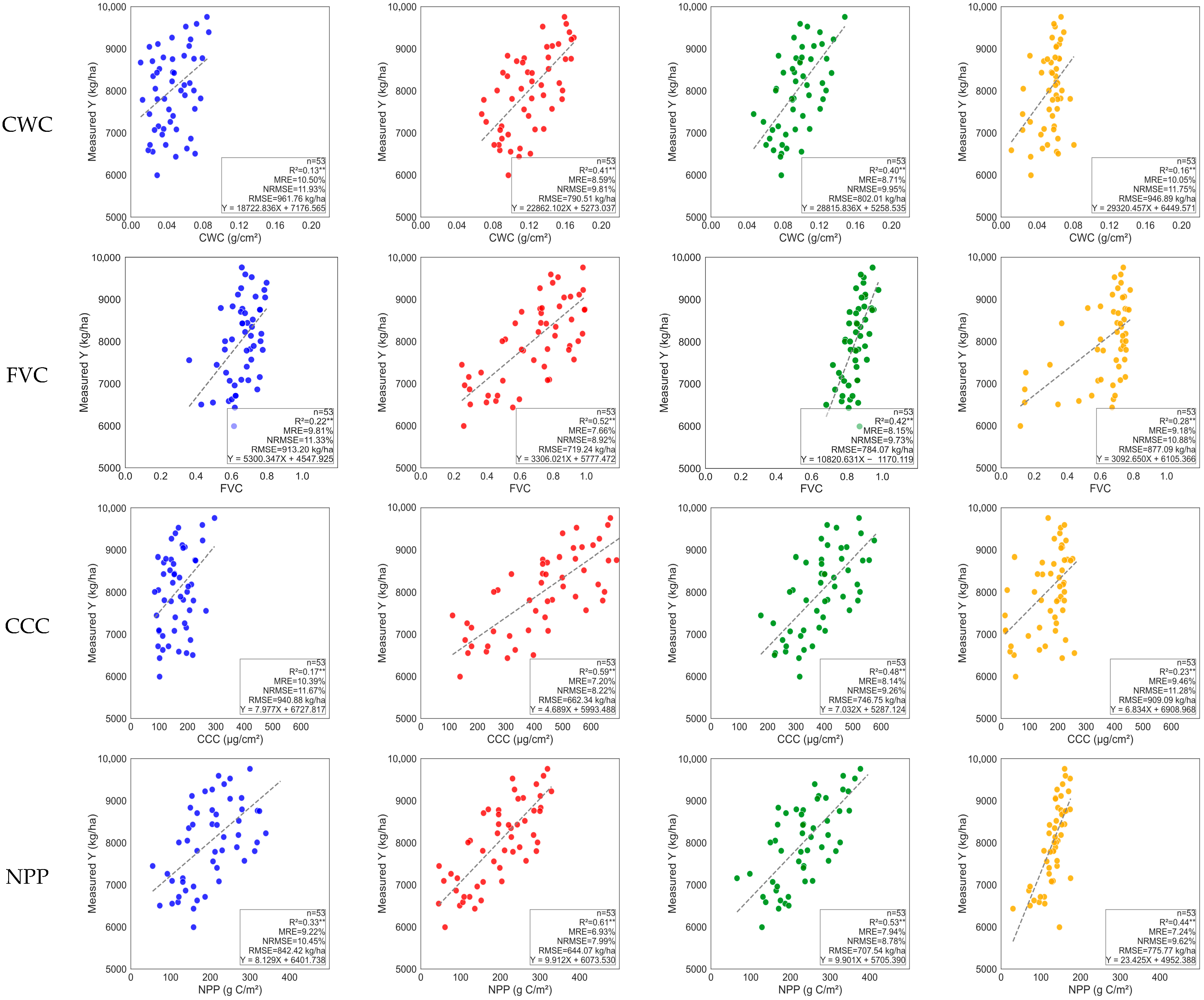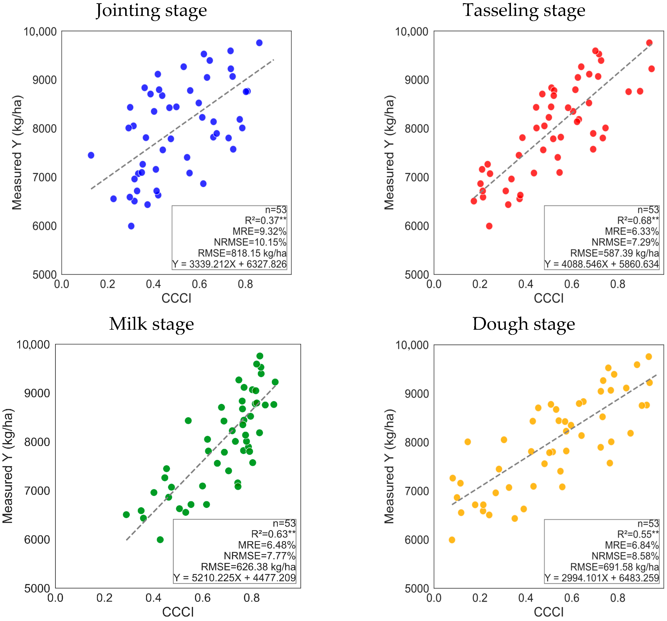 | Regression coefficient between CCCI and yield | 3339.212 | 4088.546 | 5210.225 | 2994.101 |