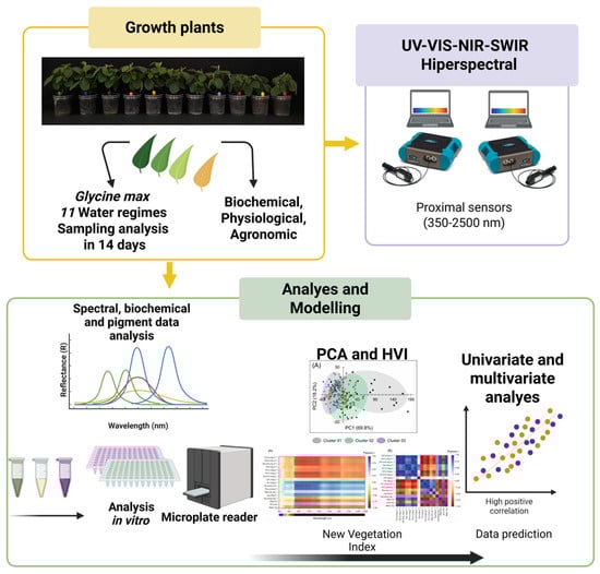 Experimental workflow for the assessment of the biochemical, physiological, and spectral responses of Glycine max under eleven water regimes. The diagram illustrates the experimental pipeline, including the cultivation of soybean plants under eleven distinct water regimes with sampling every 14 days. Biochemical, physiological, and agronomic parameters were analysed in parallel with hyperspectral data acquisition (UV–VIS–NIR–SWIR range, 350–2500 nm) via proximal sensors. Spectral, biochemical, and pigment analyses were performed both in vitro and through multivariate modelling approaches, including principal component analysis (PCA), hyperspectral vegetation indices (HVI), selected most responsive wavelengths and prediction models. Univariate and multivariate analyses were applied to predict and interpret the relationships between variables and to discriminate among treatments.