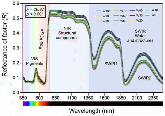 Statistically significant differences in reflectance were detected among all the treatments throughout the entire spectral range (F = 26.97, p < 0.001; n = 24), as presented in Figure 2.