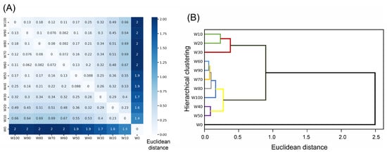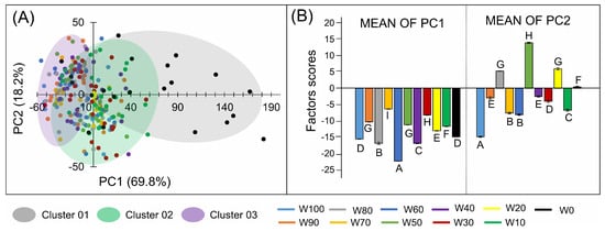 The mean factor scores for each treatment along PC1 and PC2 (Figure 3B) further supported these groupings. W100 and W80 presented the most negative mean values on PC1, whereas W0 and W10 presented the highest positive scores.