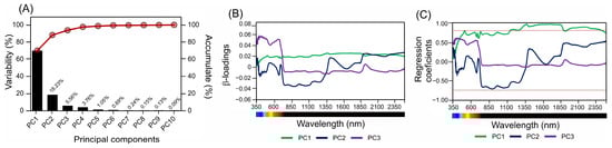 Principal component analysis (PCA) of the leaf reflectance spectra of Glycine max under different water regimes revealed clear separation among the treatments. The first two principal components explained 69.8% (PC1) and 18.2% (PC2) of the total variance, respectively. In the biplot (Figure 3A), three main clusters were identified, each corresponding to specific groupings of the water regime treatments.