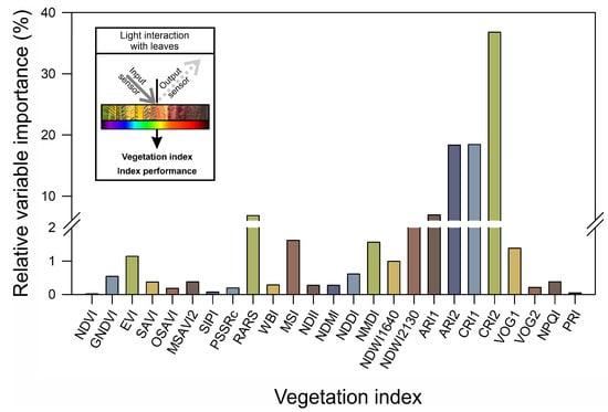 Narrowband reflectance vegetation indices (VIs) synthesize key wavelengths into simple ratios or differences, such as the NDVI, PRI and WBI, that increase sensitivity to chlorophyll content, photosynthetic efficiency and water status [,]. By condensing thousands of bands into targeted indices, VIs reduce noise and highlight physiological shifts, serving both as interpretable proxies of plant health and as robust input features for downstream models [,,]. When integrated within machine learning frameworks, these indices improve prediction and characterization by emphasizing the most stress-responsive spectral signals while limiting redundant information [].