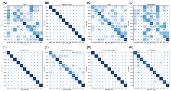 Model performance was evaluated via the external test set, with efficiency defined as models achieving training accuracy above 95%. The performance metrics included the confusion matrix, accuracy, precision, recall (sensitivity), and F1 score for each class (i.e., water regime). The confusion matrices of all the models are presented for direct visual comparison of classification performance and error patterns across all the treatments.