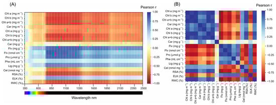 Pearson’s correlation coefficients (p < 0.001) were calculated for all the physiological, biochemical, structural, and spectral variables. For each trait, a correlation matrix was generated with all individual wavelengths, and the results were visualized as heatmaps, with color scales representing the strength and direction of the correlation (from −1 to +1). Additionally, a second heatmap was produced to visualize the correlation matrix among all measured variables, allowing for an integrated assessment of relationships between biochemical, physiological, and structural traits.