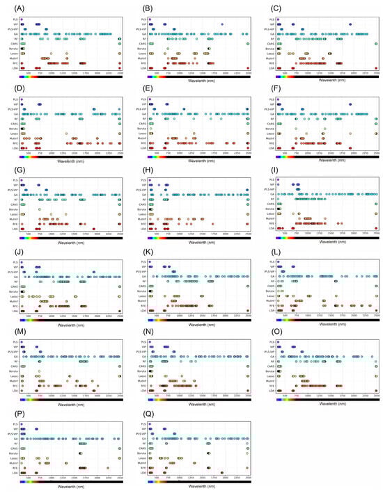 To identify the most responsive wavelengths for each physiological and biochemical parameter, multiple variable selection algorithms were applied via custom Python scripts. The following methods were implemented: partial least squares regression (PLSR), variable importance in projection (VIP), interval partial least squares (iPLS-VIP), the genetic algorithm (GA), random forest (RF), competitive adaptive repeated sampling (CARS), Boruta, Lasso, mutual information, recursive feature elimination (RFE), and linear discriminant analysis (LDA). For each variable, the top 50 wavelengths were selected on the basis of the importance ranking or selection criterion of each algorithm. The convergence and specificity of selected bands across algorithms are visualized as dot plots, where wavelength positions (x-axis) are grouped by algorithm (y-axis). This integrative approach enabled robust identification of the spectral regions most informative for each target trait.