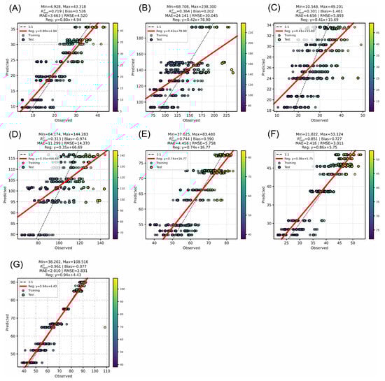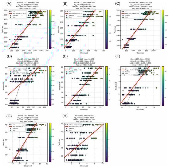 Model predictions and metrics were visualized in scatter plots of observed versus predicted values for each variable, highlighting the 1:1 line, fitted regression, and color-coded gradients by the observed variable.