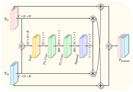 where and represents the enhanced visible and infrared features. denotes element-wise summation and denotes element-wise multiplication. The element-wise multiplication operation adds the important infrared features from the channel attention output to the visible features, while also enhancing the important visible features into the infrared features. Compared to regular feature addition, this operation allows the important channels in the infrared features to be enhanced by the visible features, while the key information in the visible features is guided by the infrared features, thereby improving the interaction between the two modalities. represents the Sigmoid function, represents n cascaded pointwise convolutional layers (n values 2), represents the global average pooling operation, and represents the concatenation operation in channel dimension.
