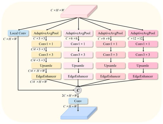 Given a feature map, and represent a set of n different pooling scales. EIE first performs the AdaptiveAvgPool operation on the input feature map to generate a feature map of size (assuming ), enabling EIE to capture features at different levels. Among them, each scale branch independently processes information of different granularities; small scales (such as 3 × 3) capture the global context information of feature map, while large scales (such as 12 × 12) retain local details. Then, each branch successively passes through the 1 × 1 convolution compression channel to C/4 to reduce computational load of the module, and then enhances local features through the 3 × 3 group convolution operation. Subsequently, the feature maps of different scales are aligned to a unified scale through bilinear interpolation operations, and EdgeEnhancer is used to highlight features edges, enabling network to better perceive the boundaries and details of small targets.