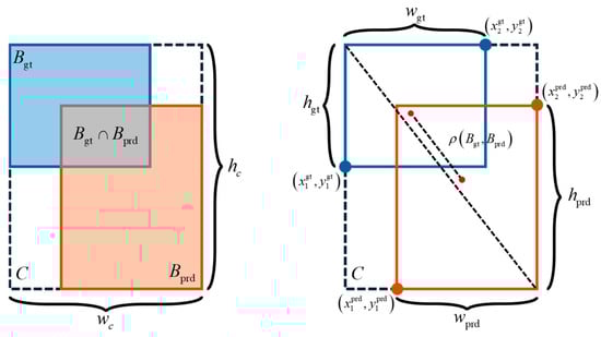 Some of the parameters involved in the formula are shown in Figure 6; is the area of the real box and is the area of the predicted box. denotes distance between the centers of these two boxes. and are the width and height of the minimum bounding box of these two boxes. is a balance term, used to balance the center point position of the bounding box and the size of the bounding box, and is the cosine value of the aspect ratio of the bounding box. The height and width of the prediction box and true box are , , , and , respectively.