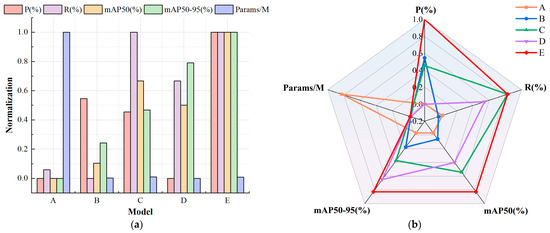 In addition, Figure 8 (all data in the figure are normalized, the closer the Params index is to 0, the better and the closer P, R, mAP50, and mAP50-95 are to 1, the better) presents the performance of each metric of DVIF-Net and the comprehensive performance of the entire model. A to E denote the five models in Table 5, respectively. It is clear from Figure 8a that the model E proposed in the article demonstrates the most balanced performance effect—it improves the mean average precision by 2.4% compared to the enhanced Model D combined with CSP-EIE, while only increasing the Params by 0.008 M. In particular, the radar chart in Figure 8b illustrates that model E has the best overall performance. It not only improves accuracy rate but also enhances detection speed.