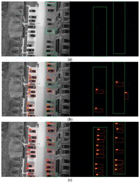 To verify the performance of the DVIF-Net method, comparative experiments are conducted on DroneVehicle cross-modal dataset, comparing it against 15 widely adopted and state-of-the-art methods. Among them are classic detection algorithms (RetinaNet [58], Faster R-CNN, Mask R-CNN [59], Cascade Mask R-CNN [60] and RoITransformer [61]), the YOLO series of lightweight models (YOLOv5n, YOLOv8n, YOLOv10n, YOLOv11n, YOLOv12n), as well as the most advanced visible and infrared fusion object detection models (CFT [54] and UA-CMDet [48], RemoteDet-Mamba [62], CDC-YOLOFusion [63], DE-YOLO [56]). The specific experimental results are shown in Table 4. Under identical conditions, we conducted comparative experiments of single-modal (visible images or infrared images) and multi-modal (visible and infrared fusion), respectively, to analyze the performance metrics of each model.