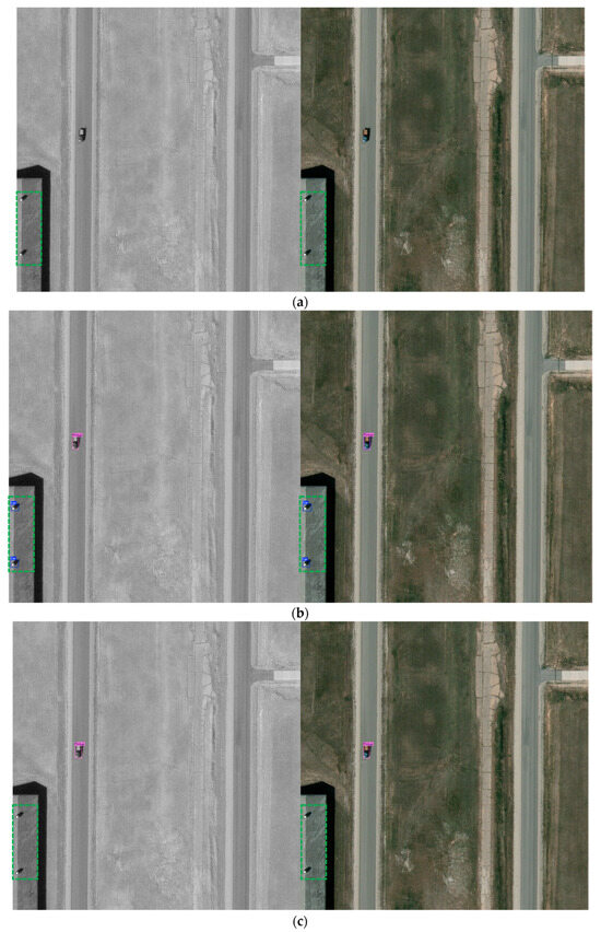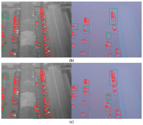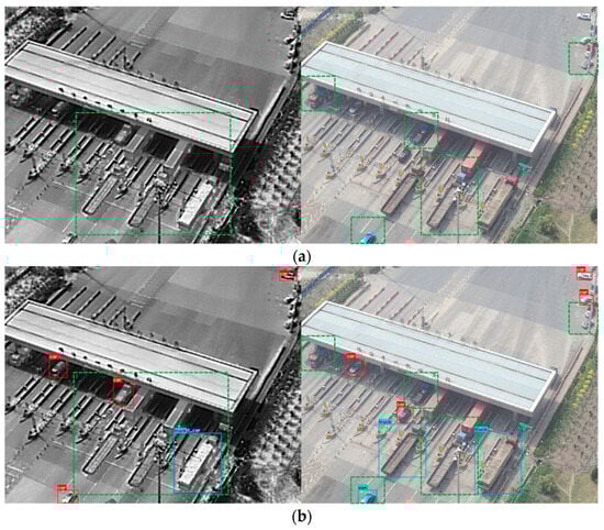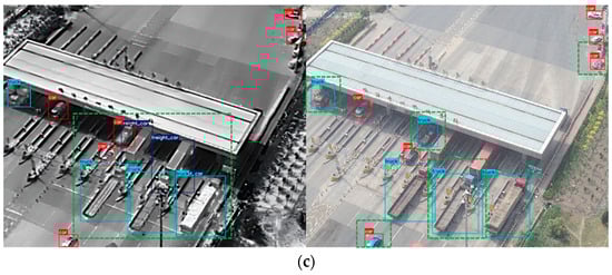 The DroneVehicle cross-modal dataset [57] is a large-scale visible-infrared remote sensing vehicle dataset created by Tianjin University in 2020. This dataset contains a total of 56,878 aerial images, including 452,570 visible vehicle targets and 500,517 infrared vehicle targets, totaling 953,087 annotated vehicle targets. These images cover vehicles captured from various weather conditions (sunny, rainy and foggy), different angles (15°, 30° and 45°) and heights (80 m, 100 m and 120 m), and possess different environmental scenes such as highways, urban roads, residential areas, parking lots, etc. Figure 7 shows some representative visible and infrared images in the DroneVehicle dataset. The images in this dataset not only present diverse scenes, but also include images from different time periods, from day to night, as well as those under low-light conditions. These target vehicles not only have differences in size, but also have characteristics such as small size, dense occlusion, and similar appearance, which greatly increase the detection difficulty of target detection model.
