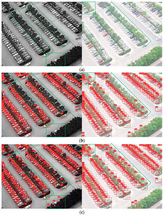 With the rapid advancement of unmanned aerial vehicle (UAV) platforms and sensor technologies, target detection technology based on UAVs has demonstrated significant application potential in fields such as military reconnaissance [1], search and rescue [2], agricultural crop monitoring [3], power line inspection [4], and security monitoring [5]. However, when UAVs are performing aerial photography tasks, their flight altitude usually varies in accordance with the specific mission environment and requirements. The variation in the flight altitude of UAV can cause targets in images they capture to exhibit diverse target characteristics in terms of scale. Furthermore, in most application scenarios, targets in UAV aerial images will also present characteristics such as small size, large quantity, and dense distribution, which undoubtedly increases the difficulty of detecting small targets in UAV aerial images. Especially in complex scenes, factors such as low resolution and environmental interference will also increase missed and false detection rates of small targets [6]. Images obtained by a single sensor are usually not effective at capturing the complete information of complex scenes, and often require multiple sensors or imaging devices to generate complementary information. Visible images are imaged by reflecting visible light, featuring rich textures and high spatial resolution. However, under extreme conditions such as insufficient lighting and target occlusion, the imaging effect is poor, which has an adverse impact on the model detection performance. In contrast, infrared images rely on the thermal radiation of the target itself for imaging, thus being less affected by lighting and weather conditions and having the ability to work all-weather. However, they suffer from severe loss of texture details and have a low contrast between target and background, making it impossible to fully reflect scene information. Therefore, relying solely on one type of image to perform object detection tasks has significant limitations, especially for UAV missions that depend on visual information. Given the complementary characteristics of visible images and infrared images, effectively fusing the two can not only retain the color, texture and edge information of visible images, but also highlight the thermal radiation information of infrared targets relative to their backgrounds, thereby improving the perception and discrimination ability of small targets in UAV aerial image in complex environments. Therefore, building an efficient end-to-end dual-modal fusion detection network is not only the key to improving the performance of small-target detection, but also an inevitable choice to promote the practical engineering application of UAV visual perception systems.