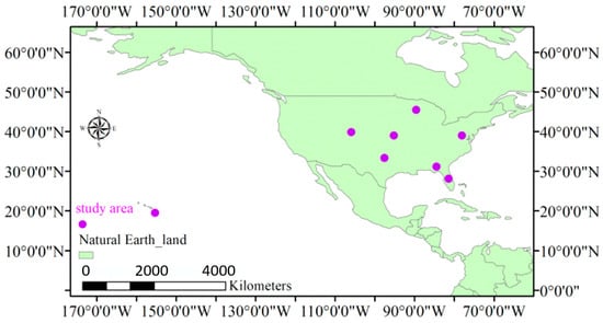 Considering that the latitude can influence the FCH estimation accuracy by altering forest vegetation types [22], we selected eight sites in North America, spanning different latitudes, as the study areas for data analysis. This was conducted to verify the applicability of the proposed IDTW, as well as the effectiveness of combining ground response functions and terrain slope parameters in addressing waveform broadening and overlap issues. Figure 1 shows the distribution map of these sites, each located in a different U.S. state. The names of the sites are PUUM, DSNY, JERC, UKFS, BLAN, WLOU, NOGP, and STEI, with the corresponding states being Hawaii, Florida, Georgia, Kansas, Virginia, Colorado, Texas, and Michigan, respectively. Table 1 shows information such as time, latitude and longitude, and topographic slope for different stations.